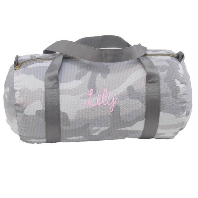 We’re thrilled to introduce our newest “baby” to our bag collection: Grey Camo! Its grey seersucker ‘Mom’ and green camo ‘Dad’ have ‘birthed’….. grey camo! And he/she has the most beautiful qualities of both parents – modern grey meet camoflauge print. It’s a perfect combination and we are in love! With it’s sleek design, you can customize this bag for any baby, child or adult, and (dare we say), it’s so darn good looking, you don’t need to even personalize it at all. But, when you do, rest assured, this seersucker fabric looks amazing embroidered in pretty much any colour you choose. This duffel bag makes a great gift for young kids! Big enough for an overnight bag or to carry your clothes to ballet class or sports programs, this personalized duffel bag looks even cuter with a personalized name or monogram!