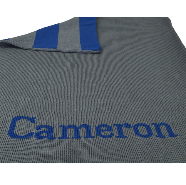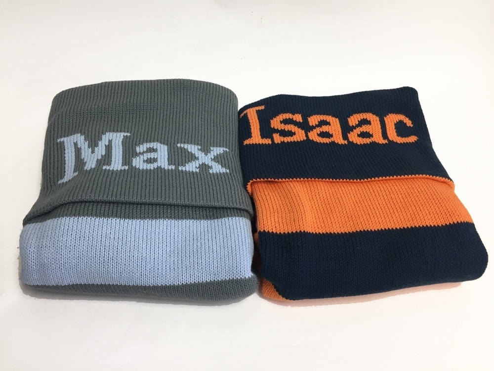 If there was ever a blanket to splurge on, this would be it! Hand knit from ultra-soft, thick 100% cotton, the reversible personalized baby blanket can be done in any color combination of your choice. The child’s name will be knit on the solid reverse side. Use it in the stroller, over a rocking chair, on the floor, or in the crib when the child is older: with any number of uses, this blanket will be treasured for years to come.