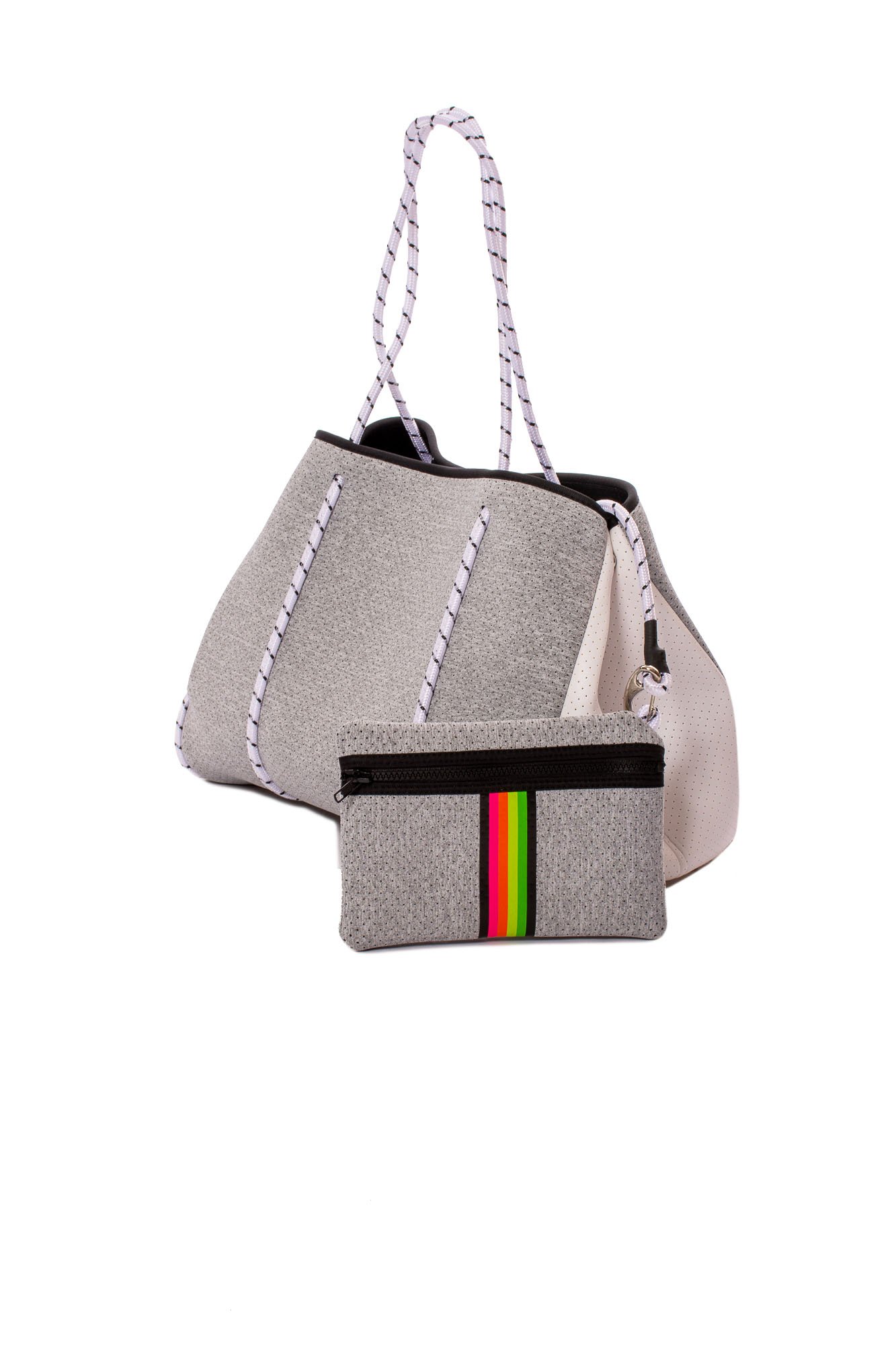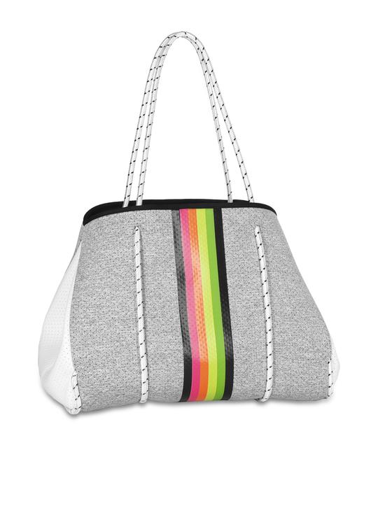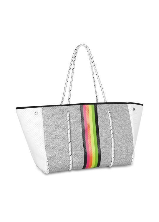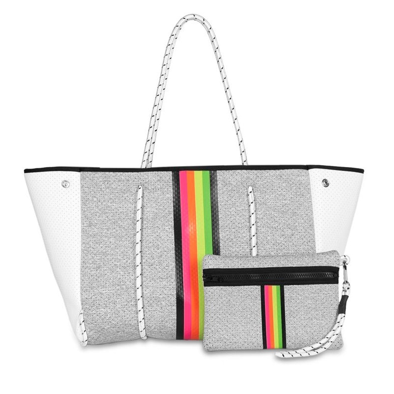 This neoprene tote is the perfect blend of style and functionality. Gray Marle/White Coated Sides/Rainbow Stripe