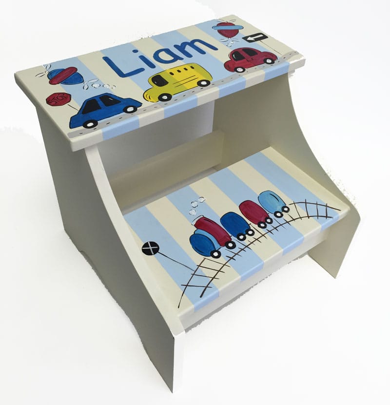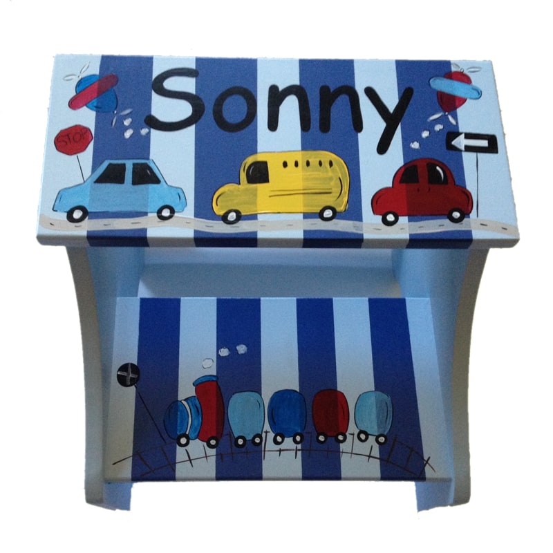 Each stool has been hand cut and hand painted just for you. Choose to have this design on a footstool or a stepstool. Proudly made in Canada! This fun and colourful stool is the perfect gift for any growing child and will last for years to come. Give your kids a bit of independence with a step up to reach for things just beyond their height. Whether it is a step up for the bathroom sink, toilet or to reach the top of their mattress. This is a personalized stool that they will use for years to come.