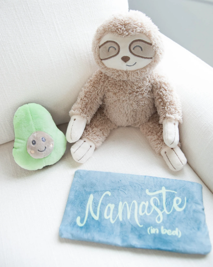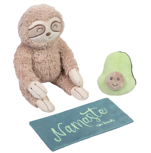 - 3-Piece set includes plush sloth plus crinkle namaste yoga mat and a rattle shaped like an avocado