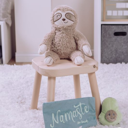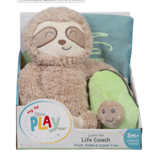 Layne Slowga (the sloth) is a super soft hard-working life coach who brings a yoga mat filled with crinkle paper and a rattle shaped like an avocado. Layne commutes from Take It Easy Terrace in Mangrove Forest in South America. Layne is designed to nurture sensory development and hand-eye coordination as a STEM early learning toy and provides comfort and companionship as well as satisfying tactile and sound play.
