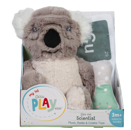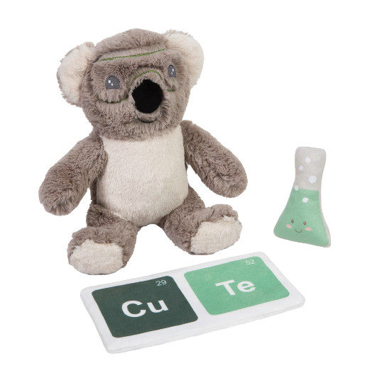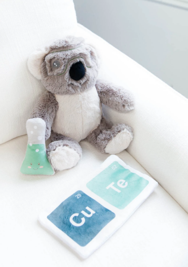 - 3-Piece set includes plush koala bear plus crinkle periodic table and a rattle shaped like a test beaker.