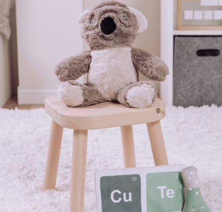 Sam Koalified (the koala bear) is a super soft hard-working scientist who brings a CU-TE periodic table filled with crinkle paper and a rattle shaped like a test beaker. Sam commutes from 300 Eucalyptus Trail in the Eucalyptus Forest in Australia. Sam is designed to nurture sensory development and hand-eye coordination as a STEM early learning toy and provides comfort and companionship as well as satisfying tactile and sound play.