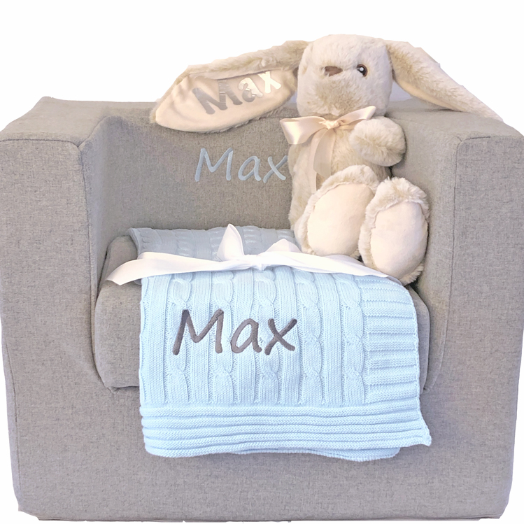 We hate tooting our own horn, but a great baby gift basket only really manages to make you to look good too! This gorgeous gift set is fit for any new baby prince. Included in this stunning baby gift basket is our most popular personalized chair by Monte Design.  The cubino is a kid’s chair parents won’t need to hide when guests arrive. Made of thick and durable microsuede, this sturdy and comfortable chair has a modern ash grey fabric, a removable seat cushion, and completely removable and machine washable covers. Whether lounging during a cartoon, or reading books on their own, kids will love this cool chair.  Also included is our best-selling personalized cable knit blanket,  a nursery essential that can be turned it into a beautiful heirloom piece. It’s washable 100% cotton and generously sized, so it’s practical, too!  To finish off this amazing  gift, an irresistibly soft personalized long-ear bunny, which makes the perfect snuggle buddy.