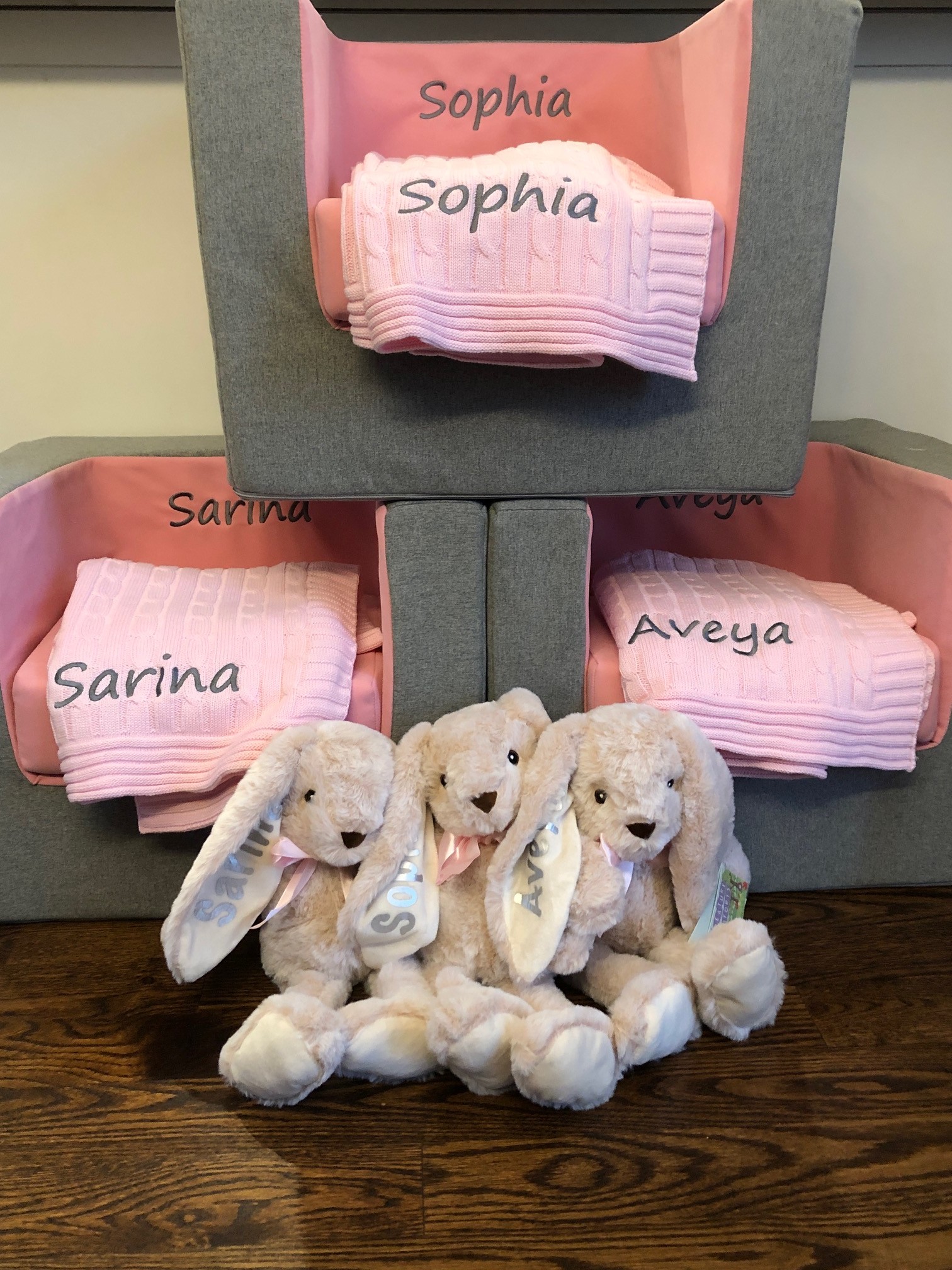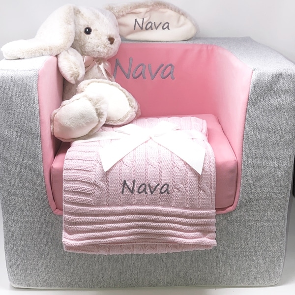 We hate tooting our own horn, but a great baby gift basket only really manages to make you to look good too! This gorgeous gift set is fit for any new baby princess. Included in this stunning baby gift basket is our most popular personalized chair by Monte Design.  The cubino is a kid’s chair parents won’t need to hide when guests arrive. Made of thick and durable microsuede, this sturdy and comfortable chair has a modern ash grey fabric, a removable seat cushion, and completely removable and machine washable covers. Whether lounging during a cartoon, or reading books on their own, kids will love this cool chair.  Also included is our best-selling personalized cable knit blanket,  a nursery essential that can be turned it into a beautiful heirloom piece. It’s washable 100% cotton and generously sized, so it’s practical, too!  To finish off this amazing  gift, an irresistibly soft personalized long-ear bunny which makes the perfect snuggle buddy.