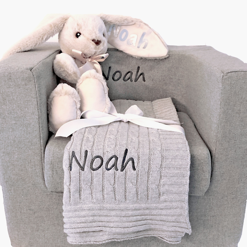 We hate tooting our own horn, but a great baby gift basket only really manages to make you to look good too! This gorgeous gift set is fit for any new baby. Included in this stunning baby gift basket is our most popular personalized chair by Monte Design.  The cubino is a kid’s chair parents won’t need to hide when guests arrive. Made of thick and durable microsuede, this sturdy and comfortable chair has a modern nordic grey fabric, a removable seat cushion, and completely removable and machine washable covers. Whether lounging during a cartoon, or reading books on their own, kids will love this cool chair.  Also included is our best-selling personalized cable knit blanket,  a nursery essential that can be turned it into a beautiful heirloom piece. It’s washable 100% cotton and generously sized, so it’s practical, too!  To finish off this amazing  gift, an irresistibly soft personalized grey elephant, which makes the perfect snuggle buddy.