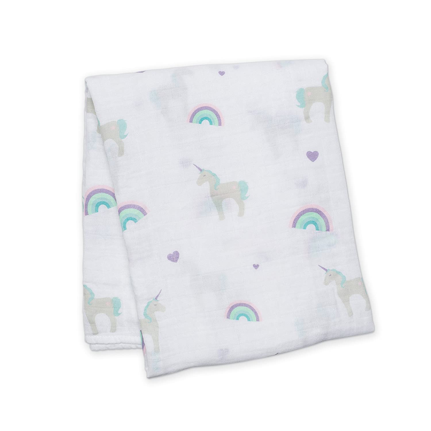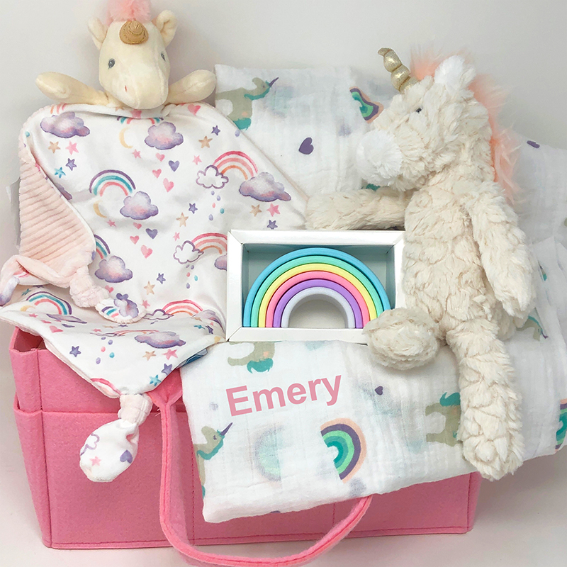 A beautiful collection of some of our favourite gifts for a new baby. This personalized baby gift set includes six items, all matching together with the softest of unicorns and rainbows design. The colour palette for this entire personalized gift set are gentle pastel pinks, purples, and blues, with fresh white and off-white fabrics. Included in this personalized baby gift basket is an extra-large all-in-one muslin cotton swaddling blanket made with finely woven muslin cloth, plus two unicorn security blankets, made with breathable muslin and a smooth satin edge that babies love to touch and hold. Also included in this beautiful personalized baby gift set is the softest blush pink 10″ x 10″ unicorn and rainbow knotted lovey blanket, perfect for little grasping hands to hold on to, and personalized with her name on it! We’ve also included a 10″ “putty” unicorn stuffed animal, known for it’s luxurious fabrics, signature soft, muted colours, and one of a kind textures, and the most amazing rainbow silicone teether and toy.
