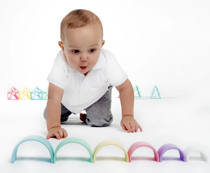 - Rainbow Teether: Contains six rainbow pieces . 100% platinum-based silicone. BPA, PVC, latex and phthalate free.